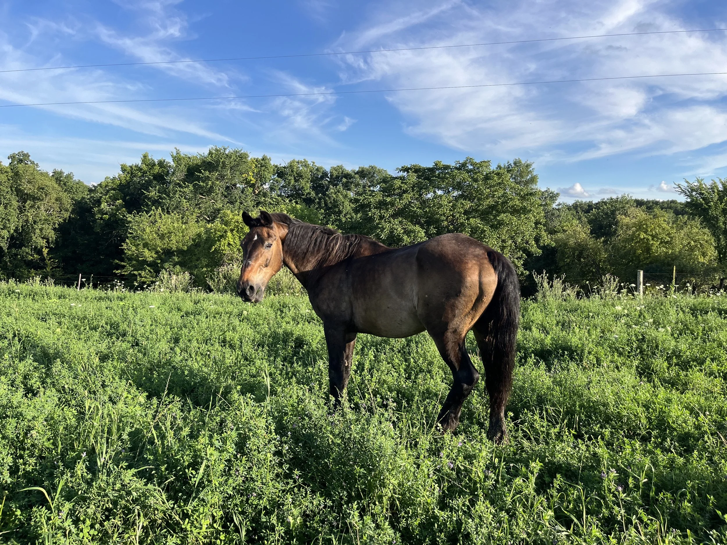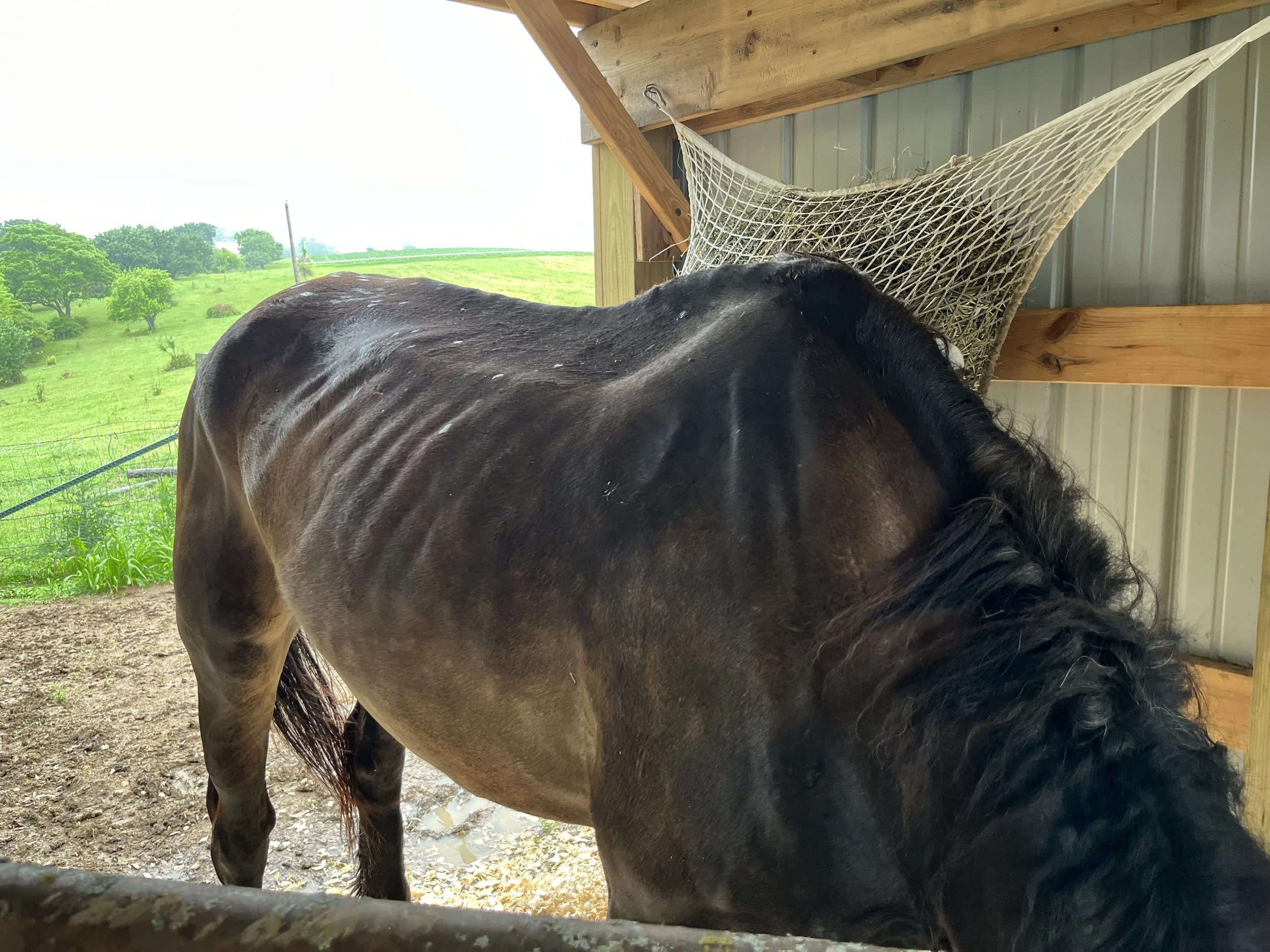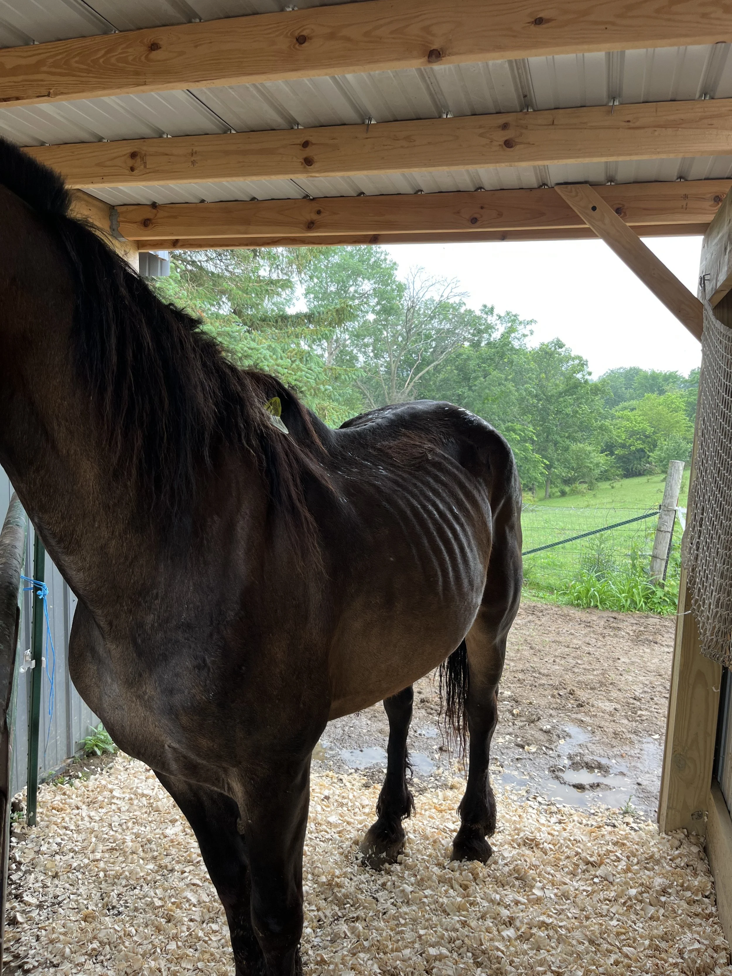 This horse worked for a living for the Amish. Unfortunately, he ended up in a kill lot in awful condition. We spent weeks soaking feed for him and nursing him back to health.